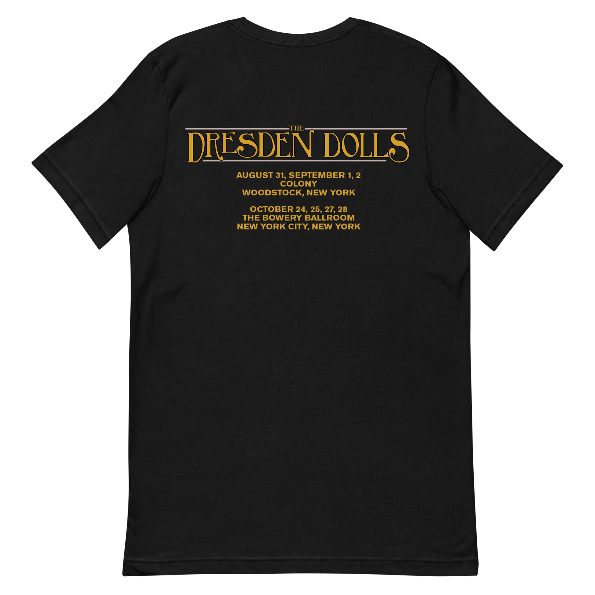 The official Dresden Dolls Reunited design printed on the front of a black tee.