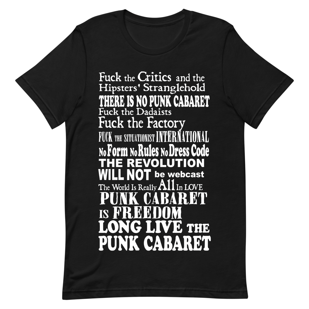 A fan-favourite design from Dresden Dolls history, the Punk Cabaret Manifesto design has been resurrected, printed on a 100% combed and ring-spun cotton black tee. The design was printed using discharge printing for an extra soft feel. This product was produced ethically and sustainably with care given to the environment and workers alike.